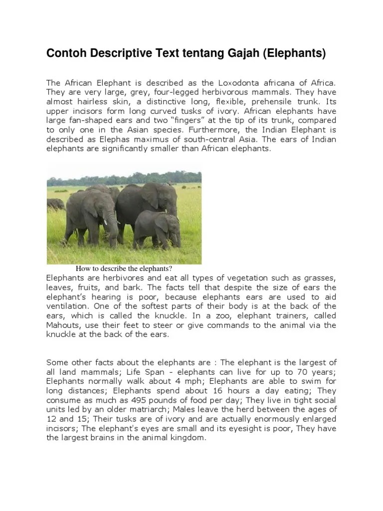 Contoh Report Text Elephants Gajah / Deskripsi Tentang Gajah Dalam Bahasa Inggris - Rumi Books / Bagaimana tidak, gajah adalah salah satu satwa yang paling dicari dan diburu.. The elephant is very intelligent animal. Sumatran elephants are the relatives of asian elephants which can be found just in the . So, this is story about elephant. The trunk is the elephant's peculiar feature. Contoh descriptive text about elephant, itulah topik pembahasan kita kali ini.